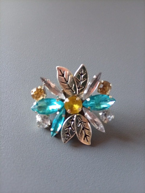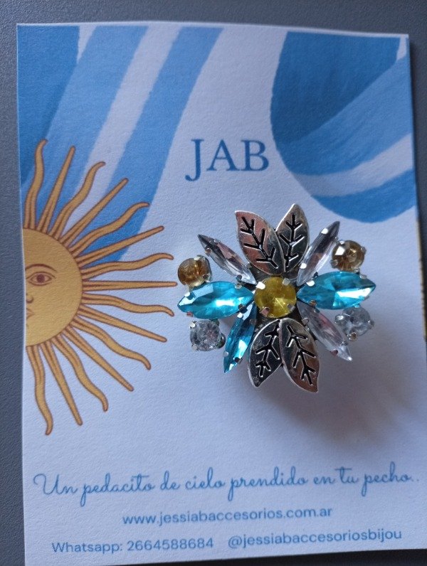 Escarapela artesanal con pin prendedor para sujetar a la prenda. Colores de gemas varian en celeste, celeste fuerte, celeste claro y celeste resina opaco.