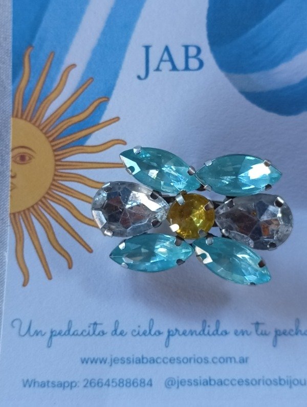 Escarapela artesanal con broche prendedor para sujetar a la prenda. Colores de gemas varian en celeste, celeste fuerte, celeste claro y celeste resina opaco.