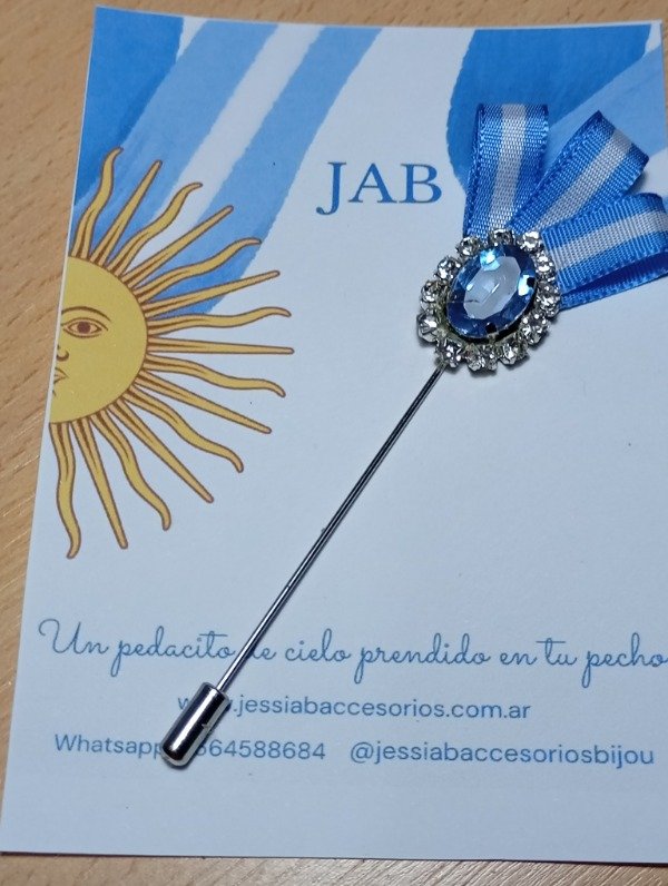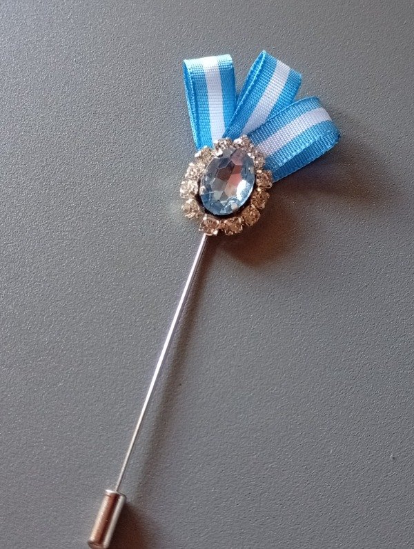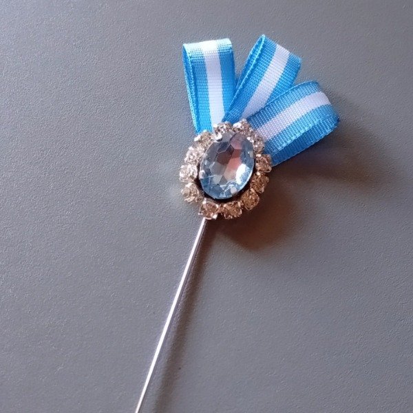 Escarapela artesanal con pin prendedor para sujetar a la prenda. Colores de gemas varian en celeste, celeste fuerte, celeste claro y celeste resina opaco.