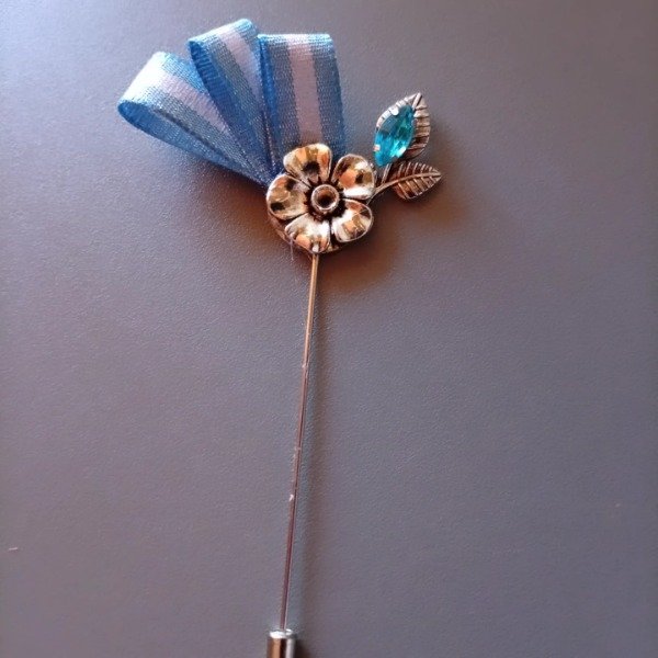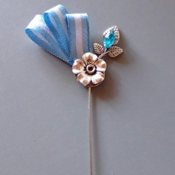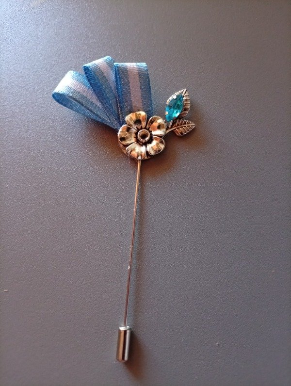 Escarapela artesanal con pin prendedor para sujetar a la prenda. Colores de gemas varian en celeste, celeste fuerte, celeste claro y celeste resina opaco.
