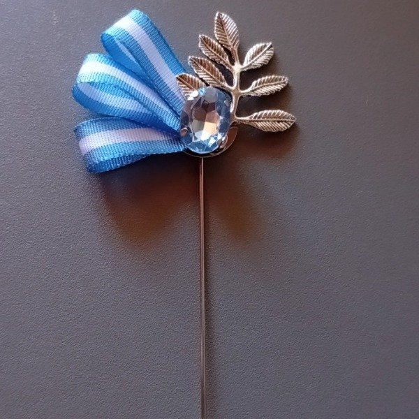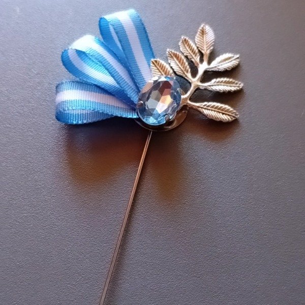 Escarapela artesanal con pin prendedor para sujetar a la prenda. Colores de gemas varian en celeste, celeste fuerte, celeste claro y celeste resina opaco.dije ramitas de varios modelos.