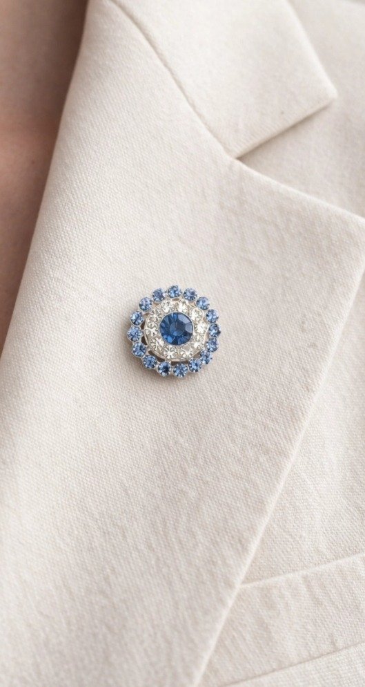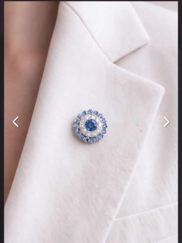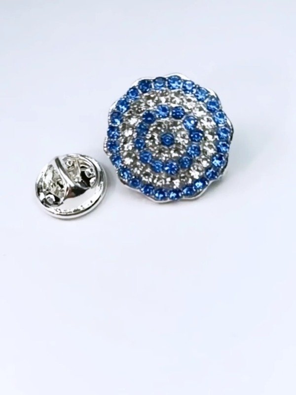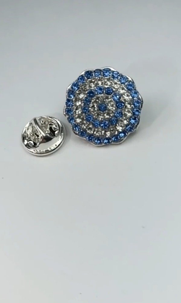 Escarapela artesanal con broche prendedor para sujetar a la prenda. Colores de gemas varian en celeste, celeste fuerte, celeste claro y celeste resina opaco.