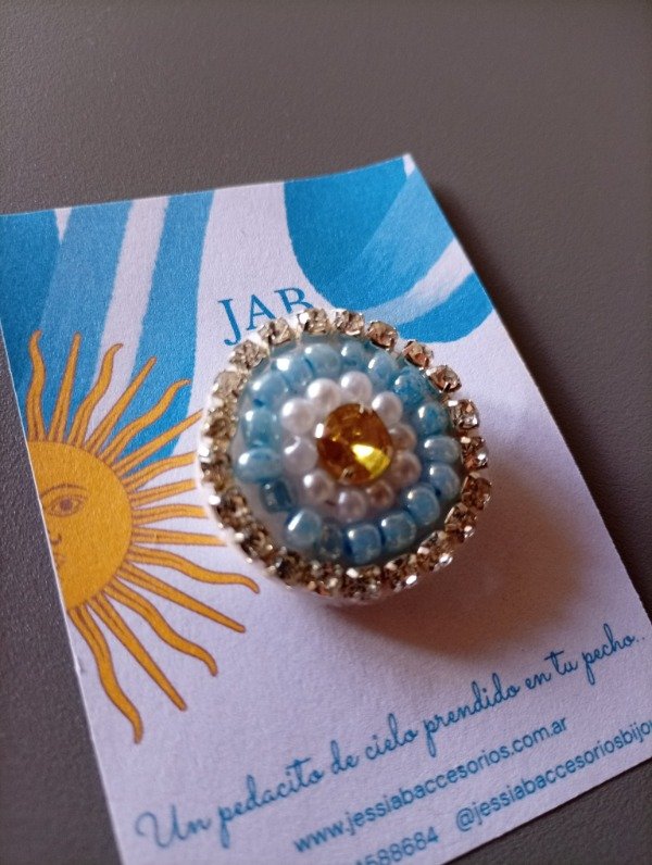 Escarapela artesanal con broche prendedor para sujetar a la prenda. Colores de gemas varian en celeste, celeste fuerte, celeste claro y celeste resina opaco.