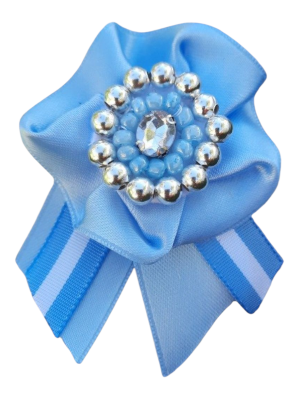 Escarapela artesanal con broche prendedor para sujetar a la prenda. Colores de gemas varian en celeste, celeste fuerte, celeste claro y celeste resina opaco.