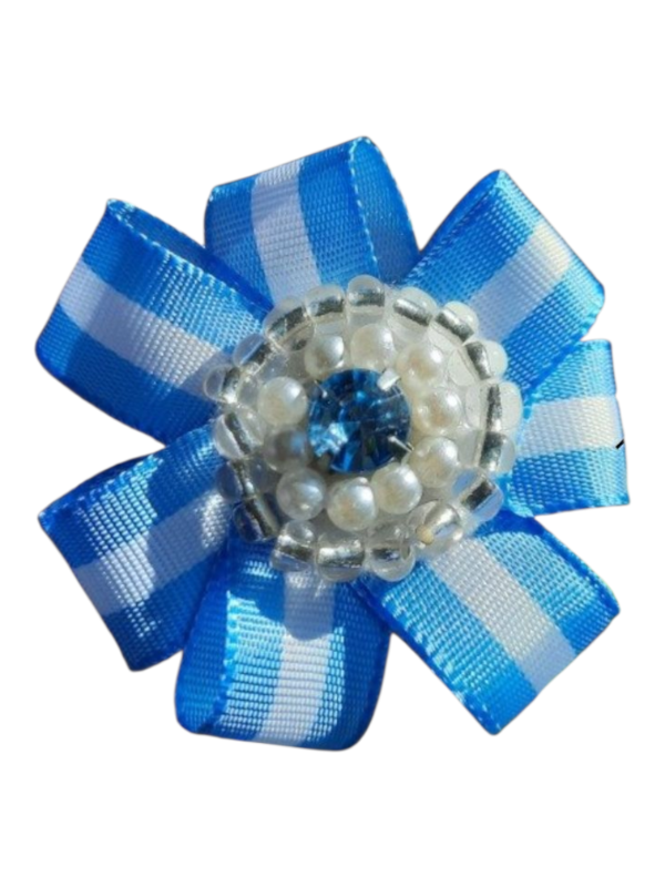Escarapela artesanal con broche prendedor para sujetar a la prenda. Colores de gemas varian en celeste, celeste fuerte, celeste claro y celeste resina opaco.